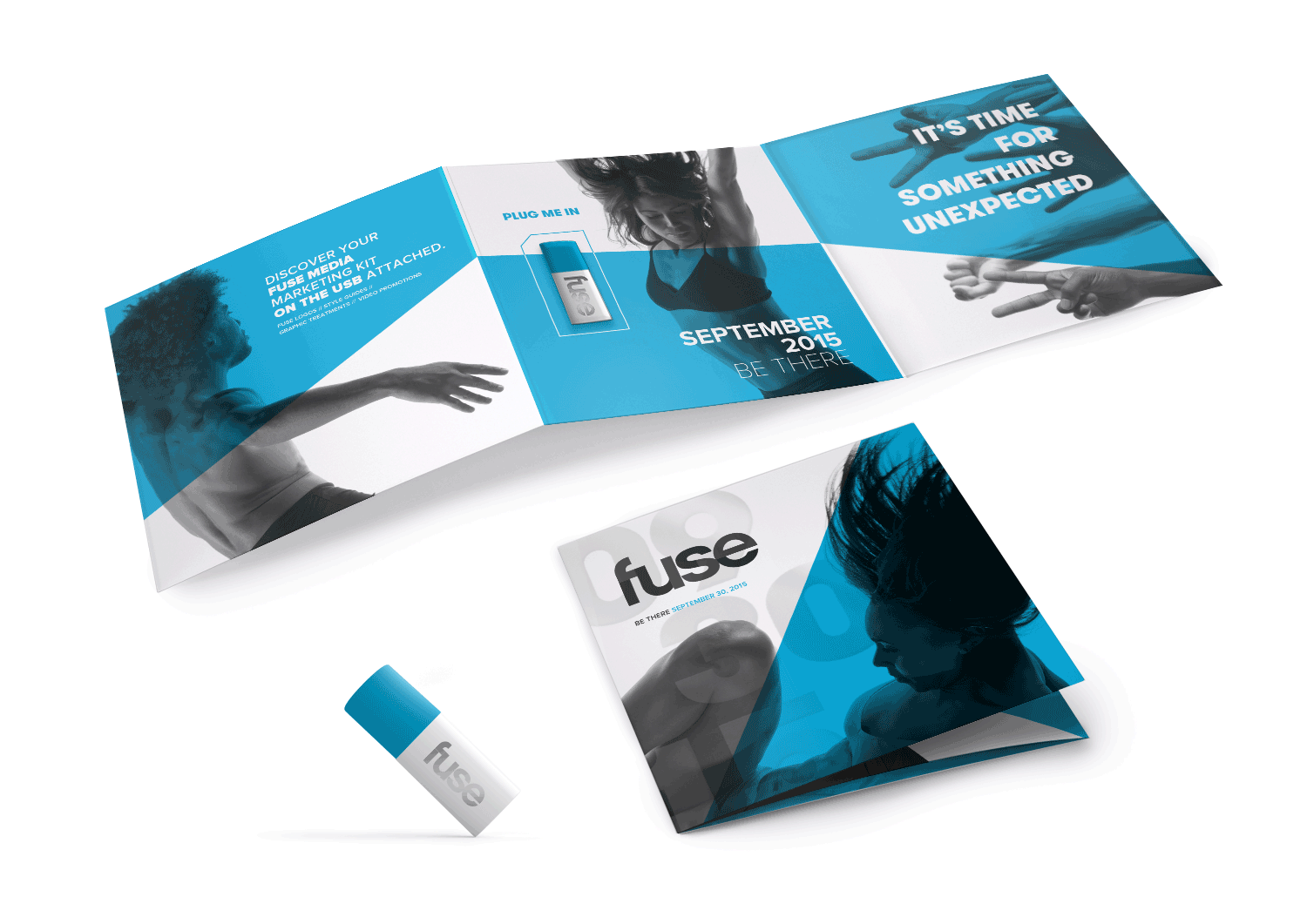 Shown above: Square trifold with branded, pre-loaded USB drive. Fuse’s brand is about the human element and providing honest, sexy, relevant and edgy content. This tone is visually represented in the trifold’s design: the black and white photography + fluidity of the dancers in motion, juxtaposed with the sharp, angled shapes in the brand’s accent color.