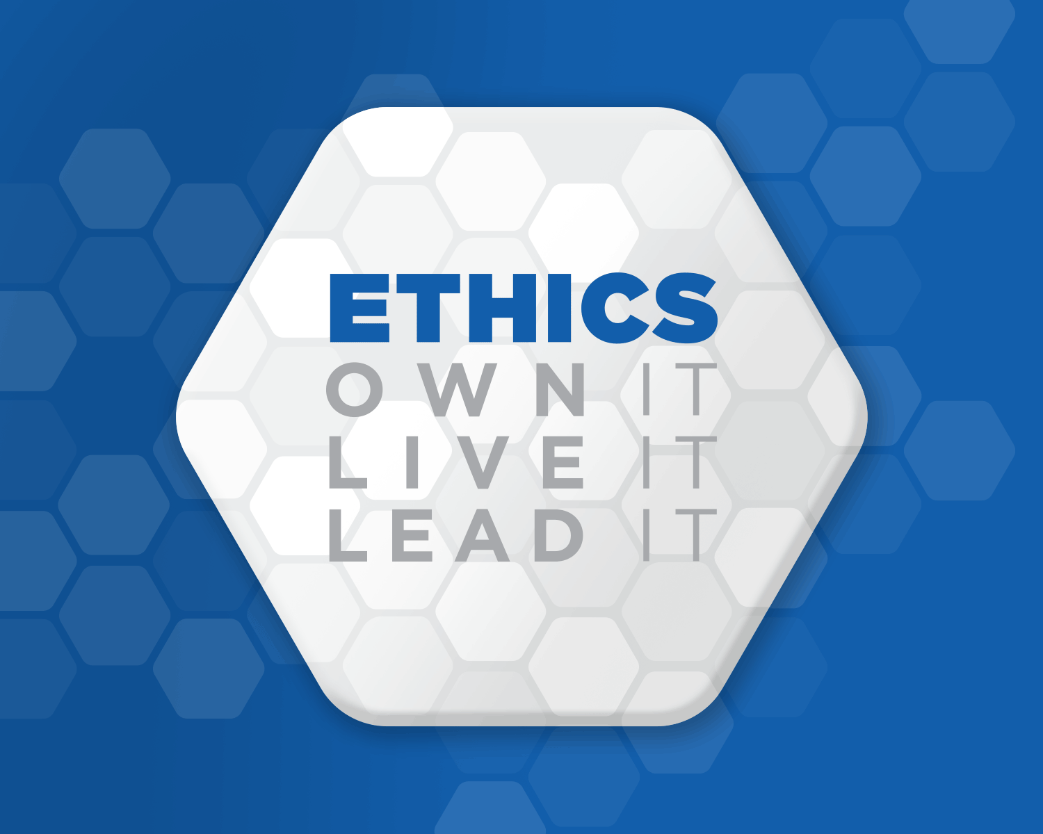 Above: Ethics and Business Conduct department motto “Ethics: Own It, Live It, Lead It”. This hexagonal shape became the key visual element that was incorporated throughout all departments. Below: Intranet portal site design for Corporate Responsibility, with access to each sub-department’s page, shown on various devices.